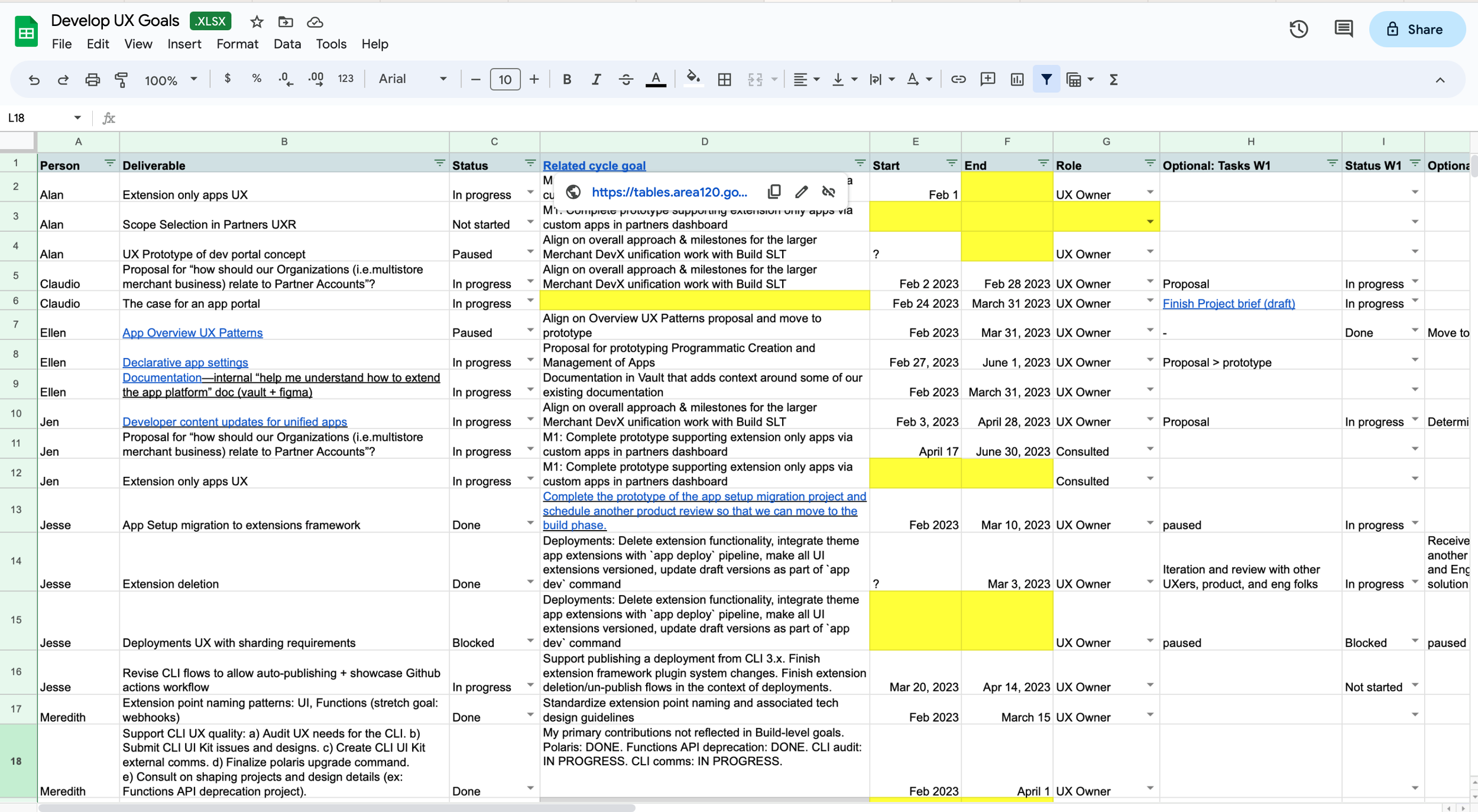 What started out as a document for myself to manage upcoming projects and keep track of my directs’ bandwidth with ongoing projects eventually became a team-wide shared sheet that mapped each individual’s projects to the org goals, aligned with shipping cycles, and a tool to escalate blocked projects.